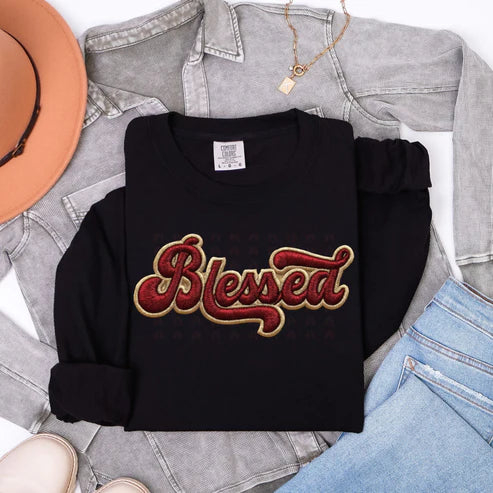 Wear your blessings loud and proud with this playful faux embroidered apparel piece. Featuring a charming "BLESSED" design that looks like intricate needlework without the delicate care requirements, this versatile wardrobe staple brings positive vibes to any outfit. Perfect for everyday wear, casual hangouts, or whenever you need a little reminder of life's good moments. Comfortable, stylish, and conversation-starting—because feeling blessed should always be fashionable.