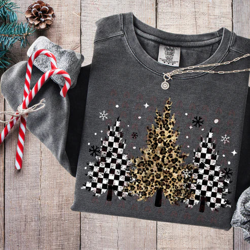 Mix pattern and festive spirit with this adorable holiday apparel featuring checkered and leopard print trees. This quirky combo brings together classic Christmas charm with modern style flair, creating a look that's anything but ordinary. Perfect for anyone who loves bold patterns and seasonal fun, this piece lets your personality shine during holiday gatherings. Cozy, cute, and unapologetically festive—your new favorite way to celebrate the season.